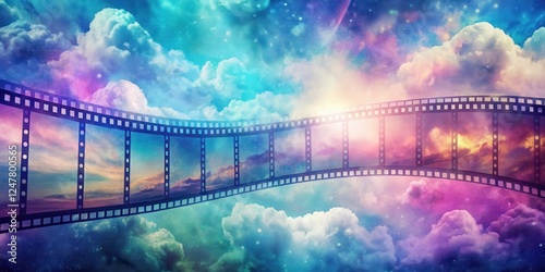 Celestial Dreamscape A Filmstrip Arcing Through a Vivid, Dreamlike Sky of Clouds and Cosmic Dust
