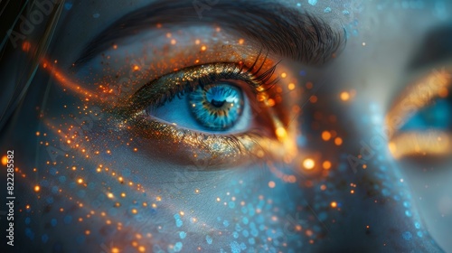 eye, blue eye, make-up, glistering, sparkle, glow, light, bokeh, beauty, fashion, closeup, macro, woman, female, mysterious, fantasy, dreamlike, aethereal, cosmic, celestial, galaxy, star, stardust, shimmer, shine, iris, pupil, eyelash, eyebrow, skin, texture, abstract, background, gold, orange, blue, teal, colours, vision, sight, looking, gaze, hypnotic, enchanting