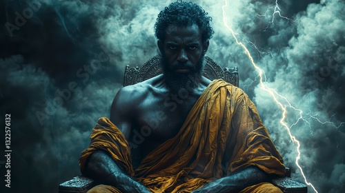 lightning, celestial, figure, power, king, god, dark, man, storm, african, art, mythology, cloud, electric, divine, throne, gold, portrait, beard, dramatic, energy, majestic, spiritual, ancient, myth, epic, aethereal, aura, sky, strong, wisdom, serene, royalty, historical, cultural, mythical, narrative, conceptual, fantasy, artistic, imagination, symbol, illustration, visual
