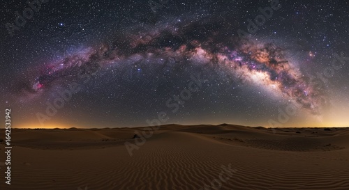 Celestial Panorama: The Milky Way's Luminous Arch Over Desert Dunes