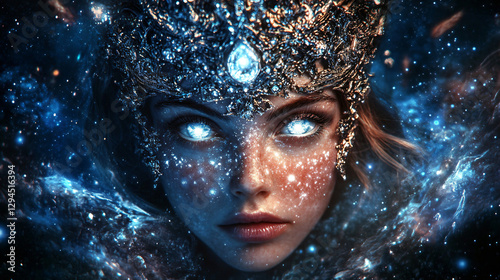 Celestial Queen: A cosmic queen, adorned in a jeweled crown, gazes with ethereal eyes, embodying the mysteries of the universe, space, and fantasy