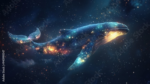 Celestial Whale: Majestic Creature of the Night Sky with Glowing Constellations and Nebulae
