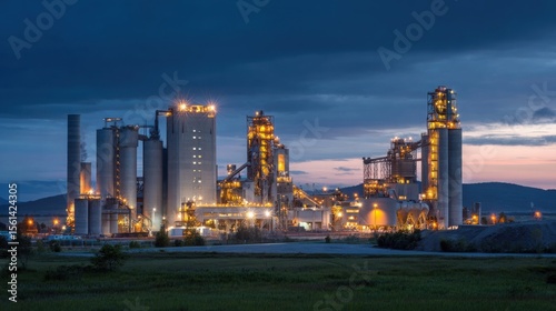 Cement factory at dusk with grain silos and illuminated equipment, an industrial landscape with a grassy field in the background.