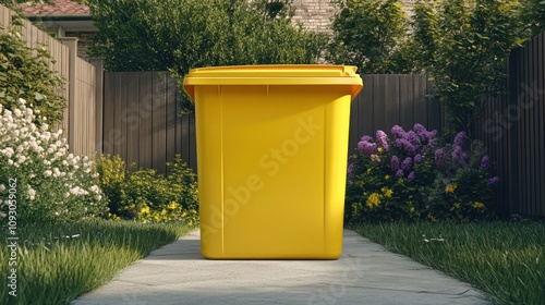 yellow, bin, garden, path, bloom, centered, greenery, order, cleanliness, structure, vibrant, bright, calmness, simplicity, contemporary, modern, exterior, waste, management, flower, neat, floral, residential, landscaping, backyard, colours, environment, home, symmetry, day, storage, scenery, fresh, shrubbery, sunlight, organisation, peace, calm, plastic