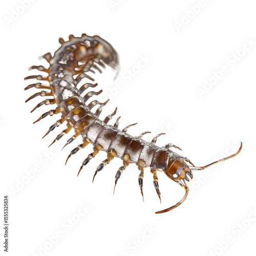Centipede crawling, segmented shiny body, natural earthy color tones, isolated macro style, 8K transparent background.
