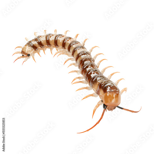 Centipede crawling, segmented shiny body, natural earthy color tones, isolated macro style, 8K transparent background.