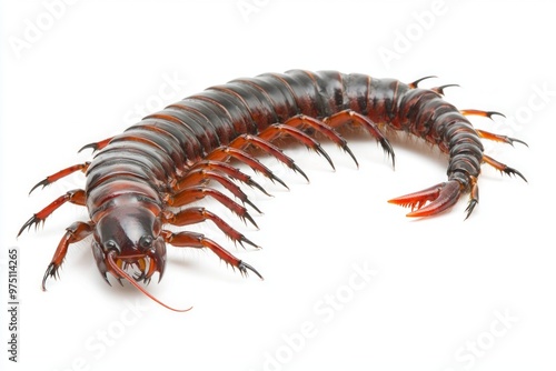 centipede moves smoothly across a pristine white backdrop, each leg extended and detailed, creating a captivating display of its natural beauty and agility.