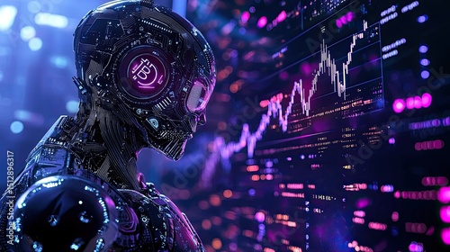 Central hyper-detailed AI quant robot in cyberpunk style, glowing blockchain data streams radiating from its core, holographic crypto charts projected