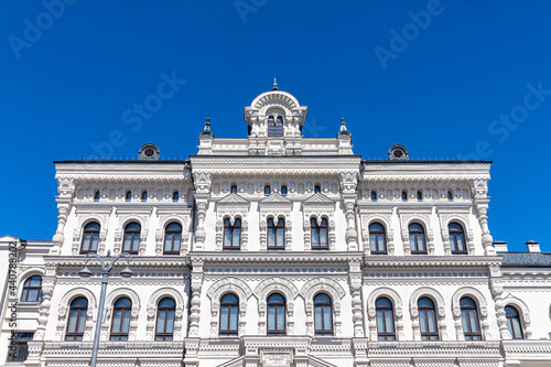 Central part of the Polytechnic Museum in the pseudo-Russian style, against the blue sky