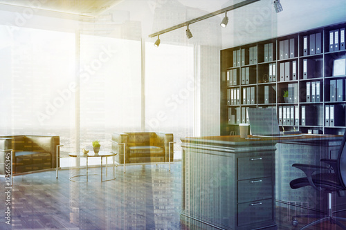 office, panoramic, table, ceo, interior, background, architecture, business, chair, company, computer, corporate, desk, render, rendering, view, window, workplace, black, design, finance, leather, luxury, manager, new, success, technology, wood, work, board, book, bookcase, corner, document, furniture, inside, laptop, shelf, blank, city, three-dimensional, comfortable, toning, filter, sunlight, exposure, double, creative