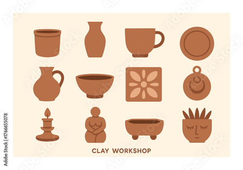 Ceramic workshop collection: clay pots, vases, bowls, planter, decor designs