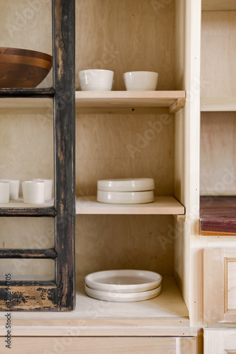 bowl, ceramic, cup, indoor, interior design, plate, pottery, shelf, styled, styling, vase, white, white bowl, white plate, wood