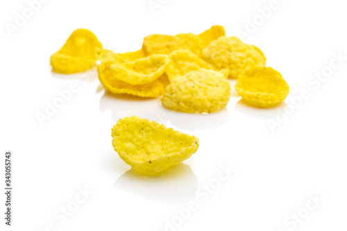Cereals breakfast. Healthy Superfood corn flakes isolated on white background. Healthy eating, dieting and detoxication concept, space for text. Macro close-up shot.
