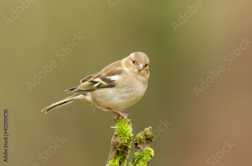 Chaffinch. Scientific name: Fringilla coelebs. Single, female common chaffinch facing to the front on moss covered branch. Clean background. Close up. Winter. Horizontal. Space for copy.