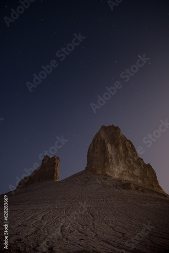 Chalk and limestone remnants in the Kazakh steppe at night against the background of the starry sky and the moon, vertical landforms after weathering in the desert