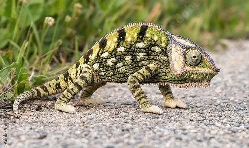 chameleon, path, grass, crossing, gravel, reptile, animal, wildlife, nature, lizzard, green, exotic, camouflage, wild, macro, closeup, colourful, tropical, africa, madagascar, walking, eye, skin, texture, scale, detail, creature, vertebrate, cold-blooded, herpetology, biology, zoology, environment, habitat, ecosystem, endangered, conservation, species, fauna, stripes, pattern, summer, day, horizontal, pet, vibrant, colours