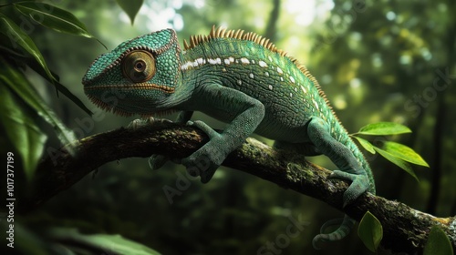 chameleon, lizzard, reptile, tree branch, green, leaf, jungle, tropical, forest, wildlife, nature, animal, fauna, pet, eye, scale, skin, camouflage, colours, close, up, macro, photo, detail, pattern, texture, background, blur, sharpened, sharp, bright, light, shadow, environment, habitat, wild, rainforest, exotic, creature, climbing, tree, twig, branching