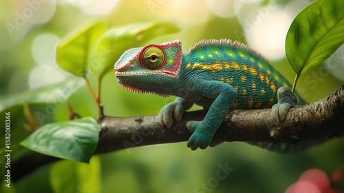 Chameleon on Branch: A vibrant chameleon perches gracefully on a slender branch, its skin a stunning mosaic of color.