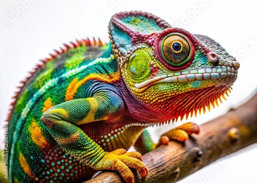 chameleon, portrait, tree branch, isolated, animal, reptile, nature, wildlife, macro, detail, texture, pattern, colours, vibrant, realistic, lighting, studio, photo, image, hi-res, digital artwork, art, photorealistic, animal portrait, fauna, exotic, background, white, closeup, tropical, camouflage, scale, skin, natural, beautiful, elegant, smooth