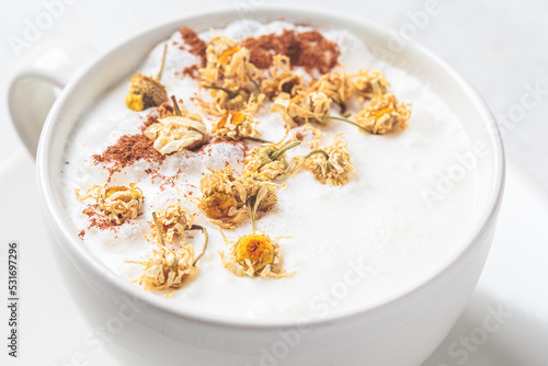 Chamomile moon milk with cinnamon in white cup. Ayurveda drink, chamomile latte tea.