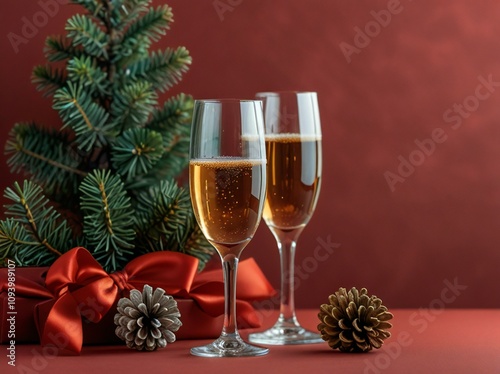 champaign, christmas, glasses, wine, celebration, holiday, drink, new, alcohol, party, decoration, year, gold, gift, beverage, eve, celebrate, table, anniversary, tree, 2, festive, christmas, ball, happy