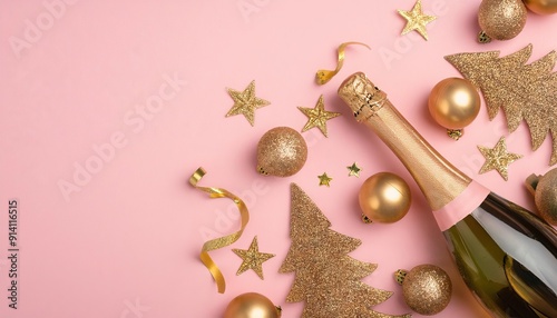 Champagne bottle and golden decoration on pink background