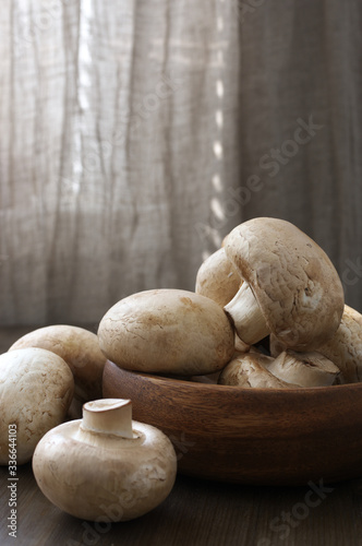 bowl, brown, champignon, copy space, cookery, diet, edible, food, fresh, fungal, harvest, healthy, heap, home, ingredient, kitchen, linen, mushroom, mushroom, natural, nobody, nourishment, organic, pile, raw, rustic, still life, table, vegan, vegetable, vegetarian, vertical, wood, wooden