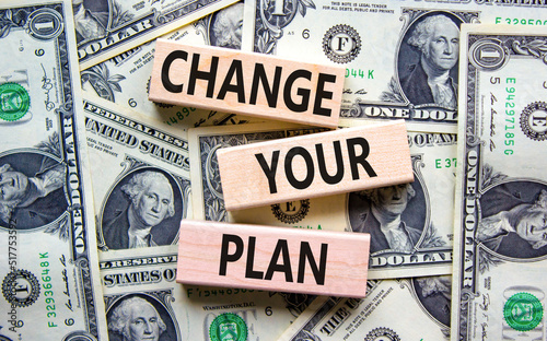 Change your plan symbol. Concept words Change your plan on wooden blocks on a beautiful background from dollar bills. Business, finacial and change your plan concept. Copy space.