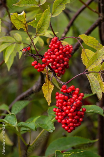 Characteristic and showy small mountain tree with red berries. Sorbus aucuparia, commonly called rowan and mountain-ash