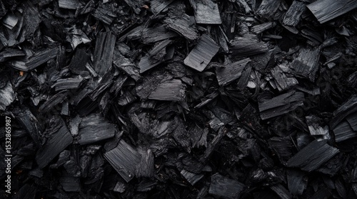 Charcoal pieces in top view on black textured surface for natural mineral raw element background
