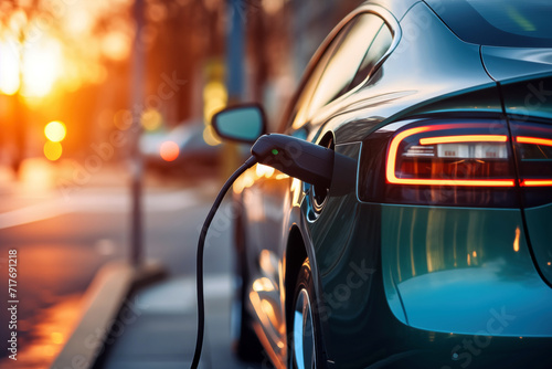 Charging an electric car on a city street at sunset, closeup