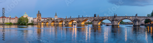 Charles Bridge (Karlův most) over Vltava river, illuminated in the evening, Prague, Czech Republic