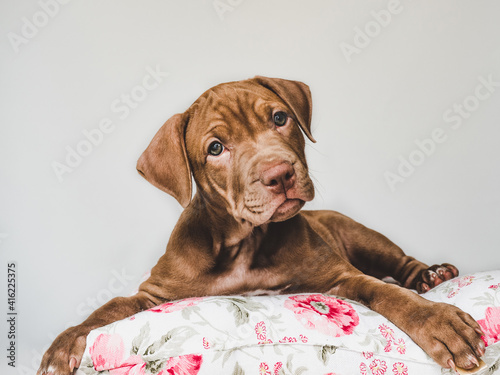 Charming, adorable puppy of brown color. Close-up, indoor. Day light. Concept of care, education, obedience training, raising pets