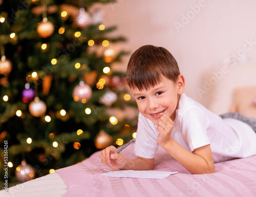 Charming boy with a mole on his cheek makes a wish and writes a letter to Santa Claus lying on the bed in his bedroom on New Year's holidays against the background of a shining Christmas tree