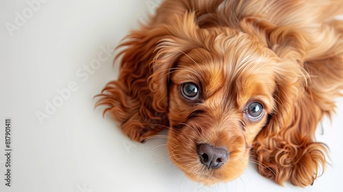 brown dog, blue eye, curious, attentive, calm, peaceful, puppy, dog, animal, photo, portrait, closeup, white, endearing, engaging, captivating, friendly, lovable, adorable, cute, furry, whisker, snout, mouth, nose, paw, tail, body language