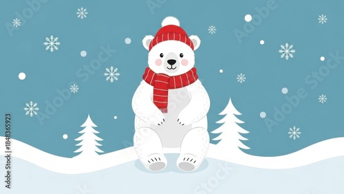 Charming cartoon polar bear wearing a warm red hat and scarf in a whimsical snowy winter