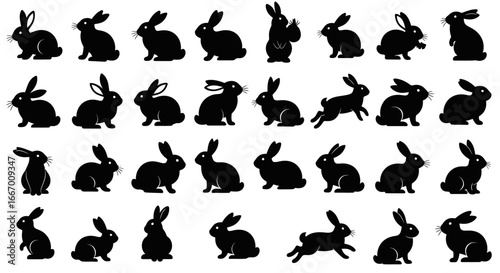 Charming collection of diverse black rabbit silhouettes in various playful poses and activities