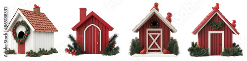Charming collection of festive red and white houses decorated for the holidays, perfect for Christmas-themed designs and decorations.