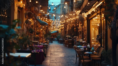 Charming European Alleyway with Outdoor Cafes and Twinkling String Lights Atmosphere