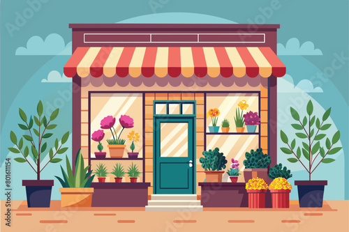 Charming Flower and Plant Shop Storefront Illustration with Awning and Potted Flowers