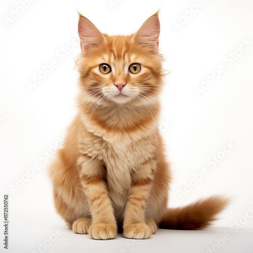 Charming fluffy orange Maine Coon kitten sitting with an inquisitive expression on a white background