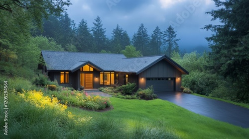 Charming forest retreat wooden cabin nestled among towering trees in tranquil woodland setting