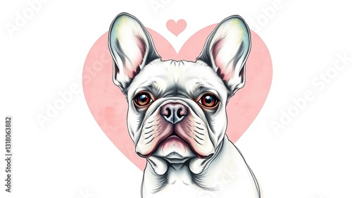 Charming French Bulldog Sketch, Watercolor Hearts Background