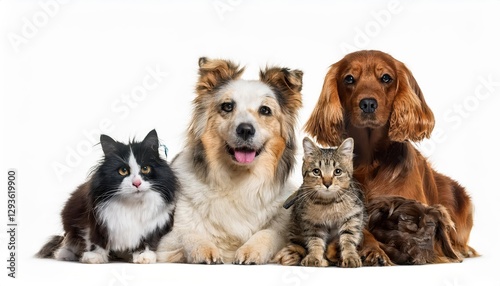 Charming Gathering of Pets Against a Pure White Backdrop, Radiating Playful Energy and Warmth as They Bask in the Evening Light.