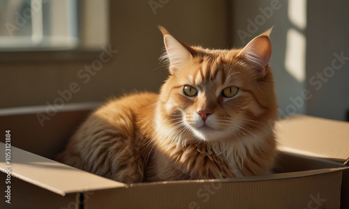 Charming Ginger Cat Sitting Gracefully in a Sunlit Cardboard Box