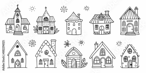 charming, house, collection, whimsical, black-and-white, illustration, vector, cute, doodle, home, artistic, outline, digital artwork, detailed, decorative, playful, creative, line art, graphic, elegant, stylish, minimal, home decor, cosy, unique, imaginative, architecture, residential