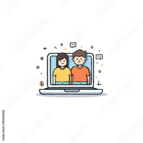 online, communication, connection, technology, laptop, couple, cartoon, character, chatting, smiling, virtual, human relationships, friends, digital, togetherness, support, happiness, love, joyful, cheerful, social, network, sharing, screen, dating, graphic, teamwork, meeting, conference, video, design, cyberspace, modern, computer, device, connectivity, conversation, illustration, friendship, partner