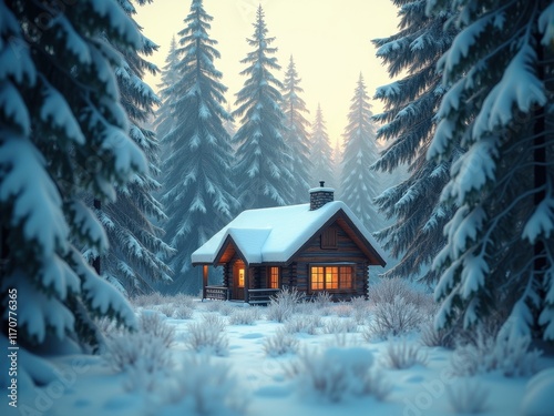 Charming log cabin nestled in a snowy forest during twilight hours with warm light glowing from the windows