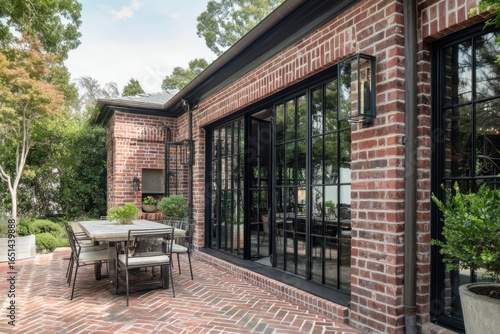 dining, patio, brick, facades, glasses, window, garden, greenery, table, setting, chair, modern, architecture, tranquil, space, home, design, relaxation, area, landscaping, cosy, atmosphere, entertaining, gathering, natural, light, decor, residential, casual attire, peaceful, serene, backyard, open, air, stylish, contemporary, foliage, bar-b-q, improvement, inviting, living, comfortable, nature, aesthetic, warm, colours, life events, summer
