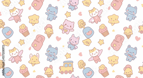 Charming pastel pattern featuring cute kawaii cats, stars, ice cream, and toys on a white background.